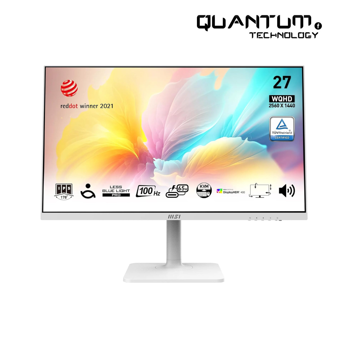 The MSI Modern MD272QXPW 27-inch Office Monitor is designed to enhance your productivity with stunning clarity and comfort for all-day use. Featuring a 2560 x 1440 WQHD resolution, this monitor delivers sharp, vibrant visuals for an immersive and detailed viewing experience. Its IPS panel ensures exceptional color accuracy and wide viewing angles, perfect for both work and entertainment. The 100Hz refresh rate provides smooth visuals for fast-moving content, making it ideal for multitasking and reducing screen tearing. Equipped with DisplayHDR 400, the MSI Modern MD272QXPW offers enhanced contrast and color depth, delivering a more vivid and lifelike picture. The eye-friendly screen reduces blue light emissions and flickering, ensuring your eyes remain comfortable during long working hours. Its built-in speakers offer convenience and minimize cable clutter, allowing you to enjoy audio without additional external devices. The 4-way adjustable stand allows you to customize the monitor's position for optimal comfort. Whether you're sitting, standing, or adjusting your viewing angle, this monitor adapts to your needs. For users requiring seamless device connectivity, the KVM switch allows you to control two computers with one set of peripherals, enhancing your multitasking efficiency. With versatile ports like DP 1.2a, HDMI 2.0b, and USB Type-C, the MSI Modern MD272QXPW is a great addition to any workspace. Ideal for office environments, design professionals, and those who need a high-quality monitor for extended use, this monitor combines performance, comfort, and versatility. Explore more advanced tech products at Quantum Technology, and for more details, visit MSI.- Screen Size: 27 Inches